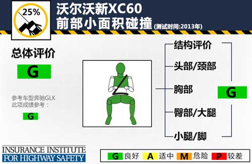 沃爾沃新XC60的最終總體評價為最高級別“G”,從成績上看新車在各項碰撞中均取得了良好的成績。值得一提的是新車不但小面積撞擊測試的總成績為良好,且其中的各項考核也均為良好,新XC60在碰撞中對車內乘員有著充分的保護。縱觀中型豪華SUV車型領域,普遍安全性都較好,我們這次選擇的參照車型奔馳GLK不但在總體評價也是最高級別,而且各大項測試成績同樣為良好。