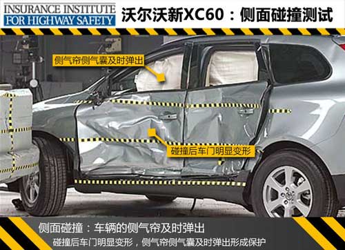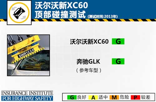 頂部碰撞主要測試車輛發生翻滾時車型結構的變化,成績可反映出側翻時車身結構的安全性,在這項測試中沃爾沃新XC60和奔馳GLK均取得了良好的成績。