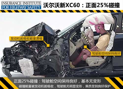 在最為嚴苛的正面25%碰撞測試中,沃爾沃新XC60的發動機艙吸收了大部分能量而潰縮,前排正氣囊、側氣囊以及側氣簾及時彈出保護了駕駛員的頭部,車輛A柱無明顯變形,駕駛艙空間保持良好,駕駛員身體其他部位也得到了充分的保護。小面積碰撞測試中新XC60的各項成績均為良好,奔馳GLK則沒有公布此項測試成績。