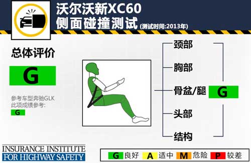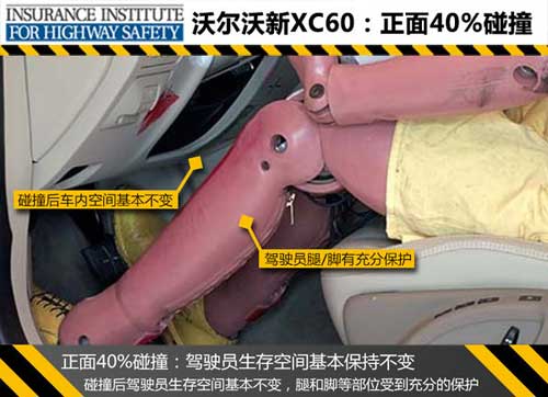 正面40%碰撞測試中,沃爾沃新XC60碰撞時安全氣囊及時彈出保護了駕駛員的頭部,碰撞后A柱無明顯變形,駕駛艙空間基本保持完整,車內人員身軀各部位都得到了充分的保護。新XC60這項測試總成績以及其中各項成績均為良好,而參考車型奔馳GLK在這項測試中駕駛員右側腿和腳部位的得分為“A”,此車型對駕駛員的腿/腳保護應進一步提升。