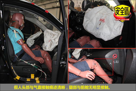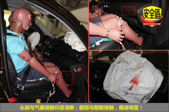 碰撞后,前排氣囊正常起爆,駕駛席假人向左微傾,安全帶緊扣,駕駛席假人頭部與氣囊接觸印跡清晰,假人腿部與前艙接觸;副駕駛席假人安全帶緊扣,腿部與前艙接觸,印跡清晰,頭部與氣囊接觸印跡清晰。