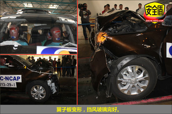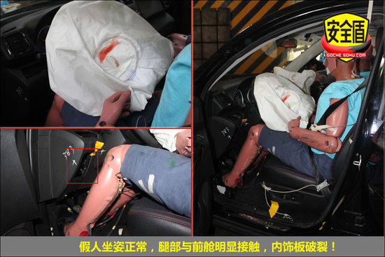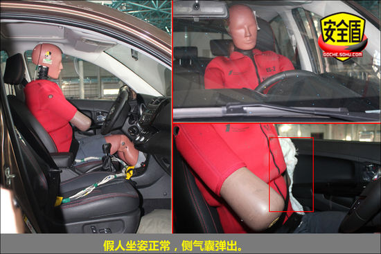 碰撞后,駕駛席座椅稍有變形,前排假人坐姿正常,側氣囊彈出,很好的保護了假人,安全帶緊扣假人身上!