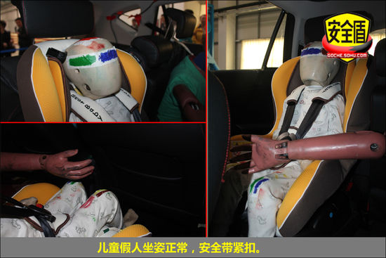 后排假人前傾,椅背固定閥失效,假人踝部深入前排椅背下,安全值得擔憂,手臂有不規則的舉動。兒童假人運動幅度較大,安全帶緊扣,手腳均有不規則舉動,安全帶緊扣,具體受傷情況還需根據安裝在假人傳感系統綜合判斷。