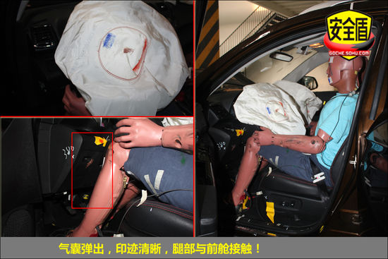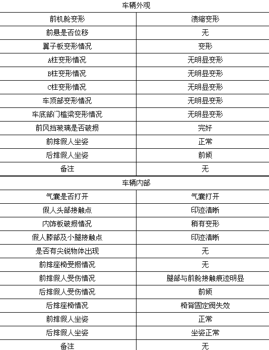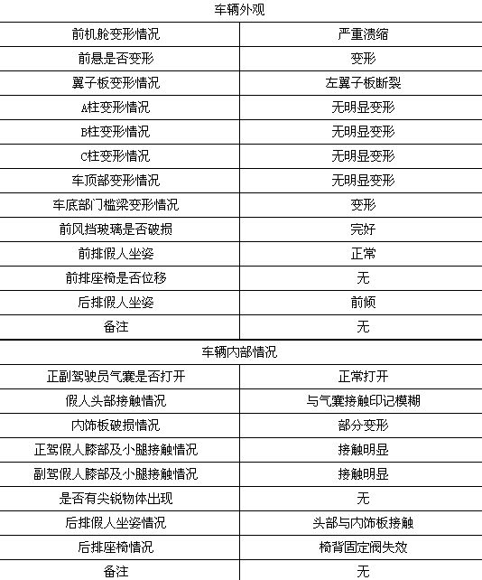 碰撞后,前排雙氣囊正常彈出,駕駛席假人頭部與氣囊觸點清晰;駕駛席假人腿部與前艙明顯接觸;轉向管柱無明顯變形;副駕駛席假人坐姿正常,氣囊觸點印跡清晰,假人腿部與前艙接觸,印跡明顯,安全帶緊扣。