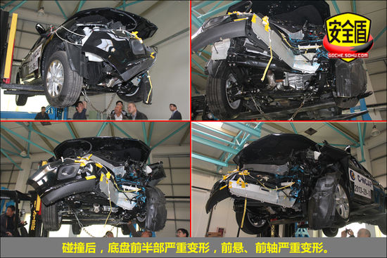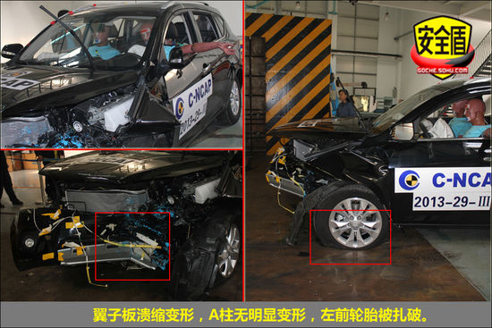 正面碰撞試驗:碰撞后,前機艙因吸收了大部分碰撞能量而潰縮變形;前排氣囊正常彈出,前排假人頭部與氣囊接觸,痕跡明顯;腿部與前艙接觸,印跡清晰,后排假人前傾,椅背固定閥失效,假人踝部深入前排椅背下,安全值得擔憂。