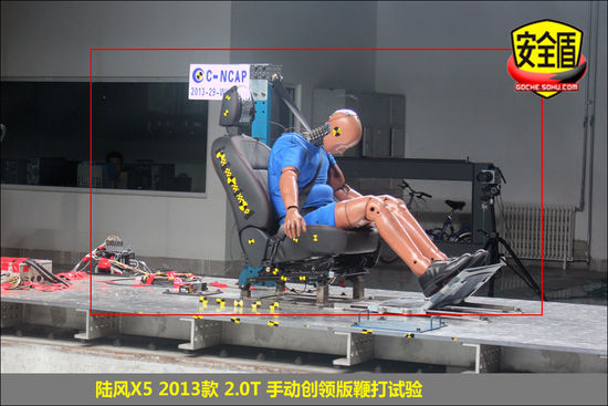 23日下午2點,中國汽車技術研究中心碰撞實驗室對江鈴控股有限公司生產的江鈴牌JX6461L型多用途乘用車(陸風X5 2013款 2.0T 手動創領版)完成了“鞭打試驗”。