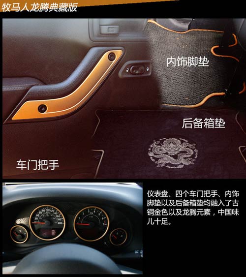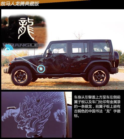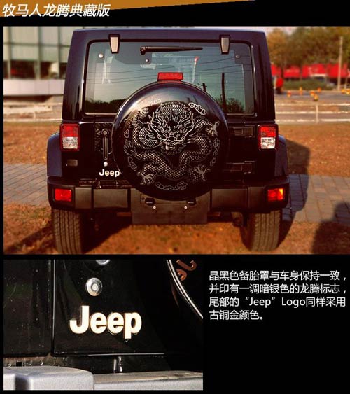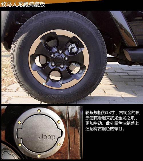 外觀上,牧馬人龍騰典藏版最吸引人的亮點(diǎn)當(dāng)屬從引擎蓋上貫穿前翼子板直到后門位置的一條金屬漆印制的銀龍,前翼子板兩側(cè)鑲有古銅金色的“龍”字徽標(biāo)。晶黑色的備胎罩也與車身保持一致,同樣印有暗銀色的龍騰標(biāo)致,此外新車采用了18寸輪轂,古銅金色的噴涂使其看上去猶如龍爪一般,同為古銅金色的螺釘也出現(xiàn)在了油箱蓋上。