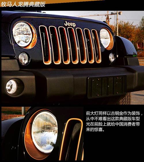 Jeep牧馬人龍騰典藏版車型是基于牧馬人Sahara打造的,經(jīng)典的七孔前進(jìn)氣格柵以及前大燈組均采用古銅金色作為裝飾,配合晶黑色的前保險杠,龍的霸氣干十足。然而這款新車并不是只有這些變化,古銅金色的裝飾只是其中之一,其融入最主要的配置還是當(dāng)屬中國特色的“龍騰”元素。