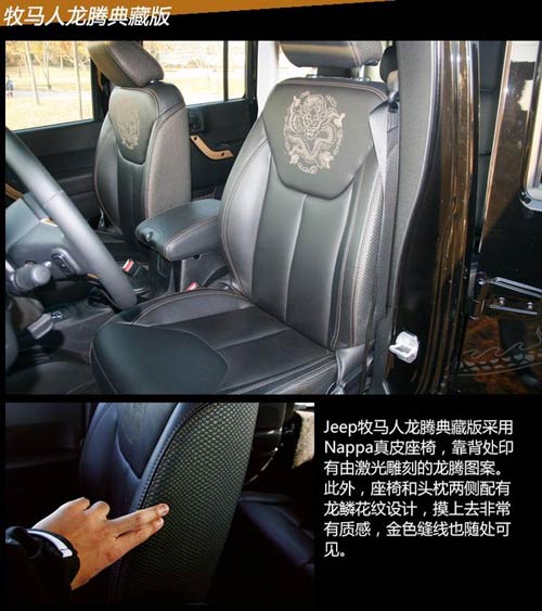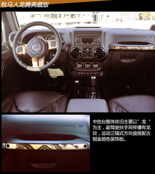 外觀細(xì)節(jié)的變化足以襯托出牧馬人龍騰典藏版車型對于中國“龍”元素的融入,在內(nèi)飾上,新車的中控臺整體依舊以“龍”元素為主,副駕駛扶手同樣鑲有“龍紋”。而三輻式方向盤上也搭配了古銅金顏色的裝飾,此外牧馬人龍騰典藏版采用了Nappa真皮座椅,座椅和頭枕兩側(cè)采用了龍鱗花紋的設(shè)計,金色的縫線也隨處可見。