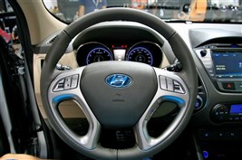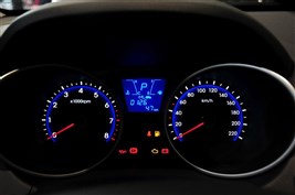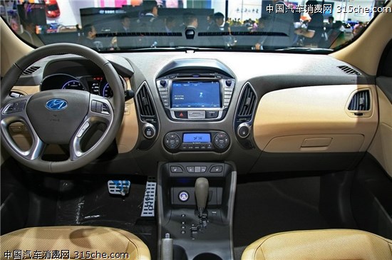 新款現代ix35的內飾繼承了現款車型的設計,造型基本未變。四輻式真皮方向盤手感很好,多功能按鍵也為行車提供了便利。雙炮筒式儀表盤造型動感,藍底白字顯示清晰,讀取方便。配色方面,ix35提供了深淺兩種配色,淺色內飾家居氛圍較濃。新iX35的做工延續了韓系車的講究工藝,即使材質是硬質塑料,經過防滑處理后,塑造了不錯的手感。
