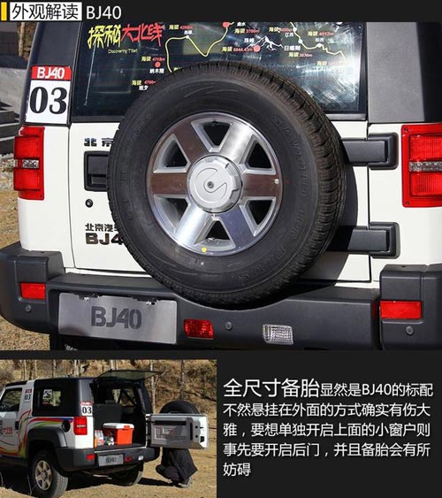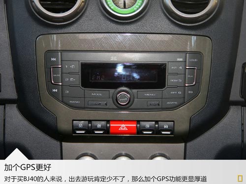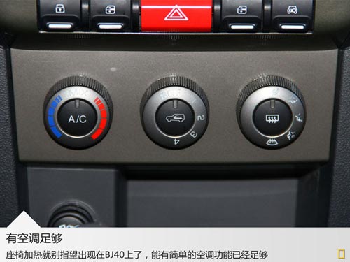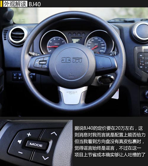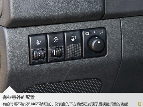 對于配置上的節儉很讓人覺得這20萬的定價有點接受不了,打個對折應該或許還算有點看頭,不過買BJ40的人應該會有不少去體驗生活的,裝個GPS成本也不會增加太多,不過BJ40竟然還配有后視鏡折疊功能,有點出乎意外。