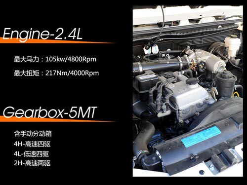 BJ40搭載的是一臺代號為G4CA的2.4L直列四缸自然吸氣發動機,這款發動機可靠和皮實是最大的亮點,由于并沒有什么先進的發動機技術,最大功率只有105kw/4800rpm,峰值扭矩217牛·米/4000rpm,在1800rpm時即可達到90%的峰值扭矩。變速箱部分則是一臺傳統的5速手動變速箱,至于會不會有自動擋車型,我認為得看市場上會有多少呼聲而定。