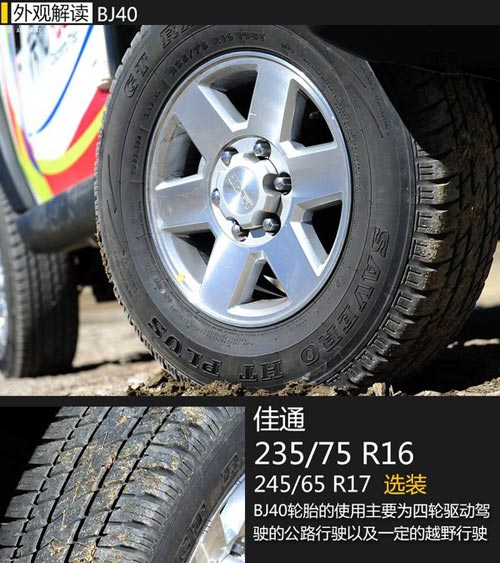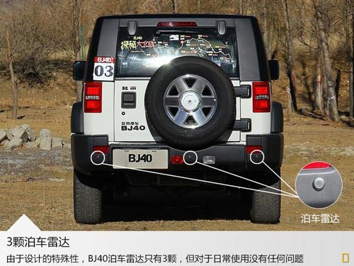 BJ40在功能性也會有所考慮,所以在車尾還能夠看到3顆泊車雷達,但是備胎就這么裸露著有些不太美觀,套個罩子或許應該更好一些,輪胎的規格也有兩種尺寸可選,當然在使用上都是城市駕駛和越野平衡性較強的輪轂。