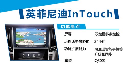 在廣州車展期間英菲尼迪帶來Q50增壓版車型,這款新車配備了采用雙觸屏多點觸控互動系統(tǒng)——全新Infiniti InTouchTM。這項智能駕駛系統(tǒng)可以提供平板電腦般的觸控效果和升級能力,使車主可便捷地與外界建立聯(lián)系或同步設(shè)置。此外這個系統(tǒng)還有著一個十分專業(yè)的團隊做后方支持,他們可以為駕駛者以最快的速度提供相應(yīng)的資訊信息。