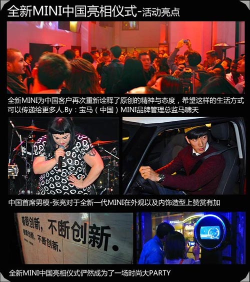 MINI品牌一直都以時尚為主題,這次全新MIN在上海的亮相儀式也不例外,現(xiàn)場聚集了各路時尚人群,儼然成為了一個時尚大PARTY,搖滾樂、美酒、香煙一個都不能少,這就是時尚的代名詞,全新MINI時尚大PARTY,Are you ready?GO~~~
