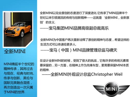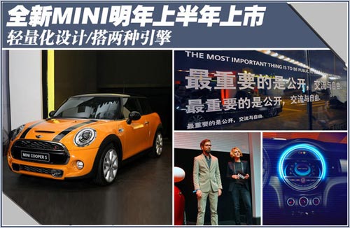 2013年7月,MINI官方發(fā)布了概念車MINI VISION的效果圖,其代表著全新MINI的發(fā)展方向。全新MINI于11月18日在牛津工廠進(jìn)行首發(fā)后,又相繼在洛杉磯、東京亮相,最終于21日完成了在中國的首秀。同時網(wǎng)通社了解到:全新MINI采用了大量的輕量化設(shè)計,將于明年上半年正式登陸中國市場,并為消費(fèi)者匹配了兩種不同排量的引擎。