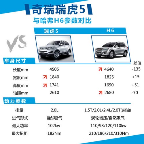 瑞虎5采用iAUTO均衡智造技術平臺打造,其車身尺寸分別為:4505/1840/1741mm,軸距為2610mm,同級別車型哈弗H6身尺寸分別為4640/1825/1690mm,軸距為2680mm,單從尺寸數據來看二者各有優勢,但瑞虎5在配置上擁有無鑰匙進入/啟動、倒車影像、倒車雷達、GPS導航、DVD影音娛樂系統、四門一鍵式升降門窗、電動調節座椅、電動防夾天窗、BOSCH9.0版本ESP、HHC坡道輔助系統,在同級別車型中優勢較為明顯,新車上市后將競爭對手直接鎖定在了哈弗H6車型上。