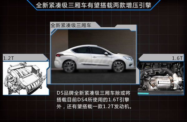 在動力方面,全新緊湊級三廂車有望搭載目前DS4所采用的1.6THP兩款渦輪增壓發動機,該款引擎最大功率120kw,最大扭矩240N·m。另外該款車型或將應用一款1.2T增壓引擎,最大功率可覆蓋60kw-100kw,最大扭矩則達到了115N·m-230N·m。