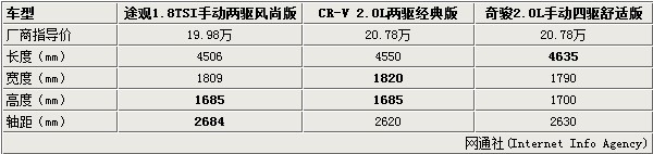 CRV/途觀/奇駿尺寸對比 CRV較為突出