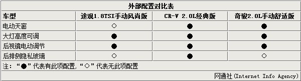 在外部配置方面,CR-V 2.0L經典版和奇駿2.0L手動舒適版均配備了電動天窗,這一配置可以有效降低內部空間的壓迫感;此外,途觀1.8TSI手動風尚版和上述兩款車型均配備了大燈高度可調以及后視鏡電動調節等便利功能;而對于相對較為人性化的后排隱私玻璃僅有CR-V2.0L經典版配備了。