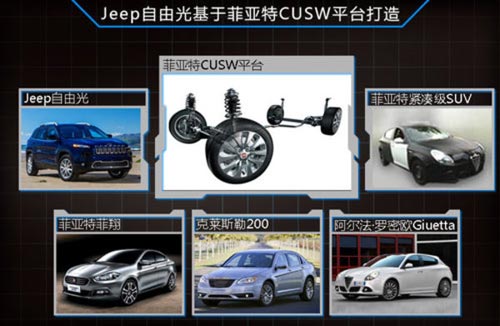 Jeep自由光采用了菲亞特全新CUSW平臺打造,而CUSW平臺具有的可伸縮特性也使自由光的軸距達到了2730mm。未來菲亞特菲翔、克萊斯勒200以及菲亞特緊湊級SUV等車型均將基于該平臺打造。平臺共通化將有利于降低車型制造成本,同時還能提升多款產品之間的零部件共享率。