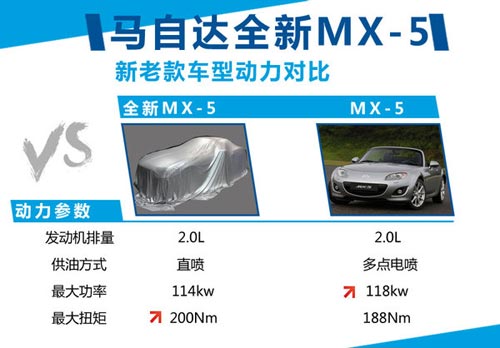 全新MX-5在動力方面搭載的是馬自達2.0L創(chuàng)馳藍天自然吸氣式發(fā)動機,采用了獨特的直噴供油方式,壓縮比可高達14:1,最大功率為114kw,峰值扭矩為200Nm,現款MX-5搭載的也是2.0L自然吸氣式引擎,供油方式則采用的是傳統(tǒng)的多點電噴,最大功率為118kw,最大扭矩為188Nm。