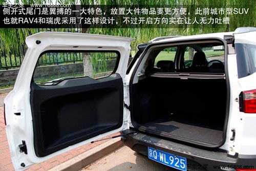 在空間方面,雖然翼搏的外觀尺寸較小,但內部空間并不顯得局促,空間的利用率很高。前后排乘客都可以獲得非常不錯的頭部和腿部空間,一般身材的人正常乘坐沒有問題。但是受到車身尺寸限制,翼搏的后備箱空間顯得稍小了一些,后備箱內有非常明顯的突起,后排座椅也不能完全放倒,影響了空間的利用率。另外要說的是雖然外掛式備胎看著很酷,可與之搭配的側開式尾門卻需要非常大的操作空間,使用比較不便。