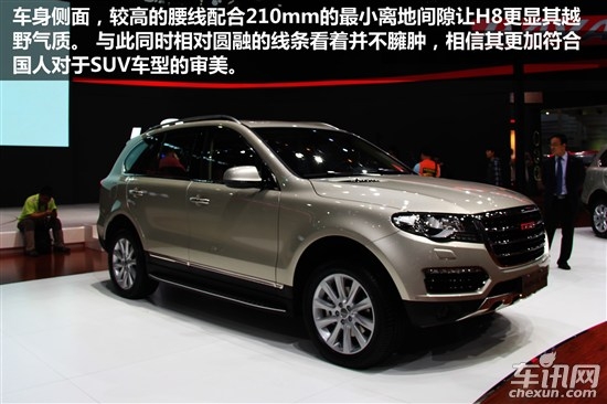 車身側面,較高的腰線配合210mm的最小離地間隙讓H8更顯其越野氣質。 與此同時相對圓融的線條看著并不臃腫,相信其更加符合國人對于SUV車型的審美。車身尺寸方面,H8擁有著比豐田漢蘭達更大的車身尺寸,其長寬高分別是4806/1975/1794mm,軸距達到了2790mm。