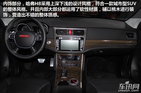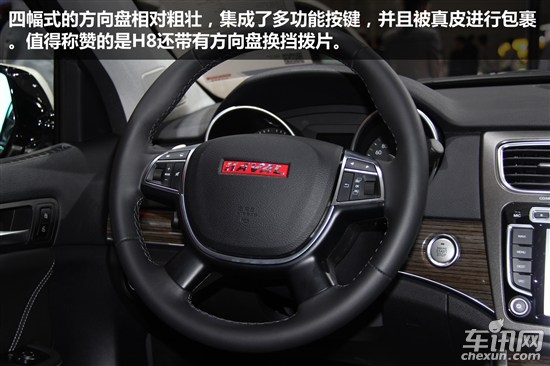 內飾部分,哈弗H8采用上深下淺的設計風格,符合一款城市型SUV的整體風格。并且內部大部分都運用了軟性材質,輔以桃木進行裝飾,營造出不錯的整體質感。四幅式的方向盤相對粗壯,集成了多功能按鍵,并且被真皮進行包裹。值得稱贊的是H8還帶有方向盤換擋撥片。
