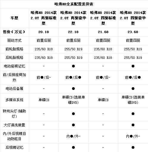 從上圖的差異表可以看出,哈弗H8分為4款車型,兩款兩驅車型,兩款四驅車型,并且標準型與豪華型的四驅和兩驅車型配置幾乎沒有任何差異,而價格上則相差1.5萬元,這1.5萬元實際上就是一套適時四驅系統的價格。