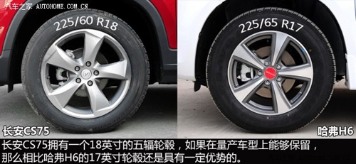 長安CS75使用了輪胎規(guī)格為225/60 R18的鄧祿普GRANDTREK輪胎,而哈弗H6的輪胎規(guī)格則為225/65 R17,根據(jù)批次的不同輪胎品牌也可能是佳通和瑪吉斯等,如果CS75今后的量產(chǎn)車能夠保留這對組合的話,那也將成為它的一個優(yōu)勢。