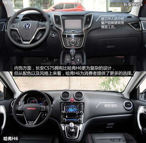 內(nèi)飾方面,CS75延續(xù)了長安一貫的設(shè)計,飛翼式的中控臺在以往的車型中也能看到類似的造型,搭配純黑的配色充滿動感與時尚。相比之下哈弗H6的內(nèi)飾設(shè)計則要簡單一些,不過由于提供了升級版與運動版兩種不同的內(nèi)飾,加之內(nèi)飾顏色也有純黑與黑/米可選,用概率學(xué)來計算的話,勝算還是哈弗H6要大一點。