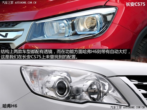 大燈是一個很能體現(xiàn)車輛設(shè)計的地方,在這方面長安CS75表現(xiàn)得尤為突出。頂部的燈眉、上下削平的“天使眼”以及開眼角式的整體造型,雖說還是帶著幾分模仿的味道,但卻并不令人厭惡。而另一位選手哈弗H6則依舊是一副穩(wěn)重的造型,不過它的優(yōu)勢在于自動大燈功能,這是我們在CS75上未曾找到的配置。