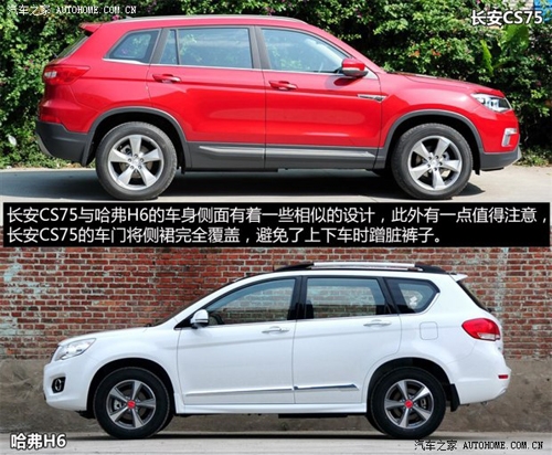 車身側(cè)面的線條兩款車型都沒太多變化,都是標(biāo)準(zhǔn)的SUV設(shè)計,就連腰線以及鍍鉻裝飾條的位置也頗為相似,不過值得注意的是,長安CS75的車門完全覆蓋了側(cè)裙,上下車時可以避免蹭臟褲子,這一點要比哈弗H6顯得人性化。