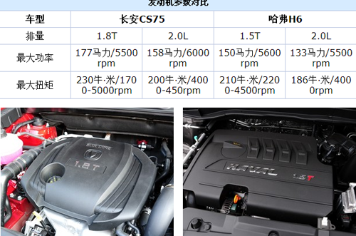 長安CS75采用了與睿騁相同的動力系統(tǒng),1.8T與2.0L發(fā)動機的組合對哈弗H6形成了直接的競爭,從賬面參數(shù)上來看,無論是排量占優(yōu)的增壓發(fā)動機還是同為2.0L的自然吸氣發(fā)動機,長安CS75都要領(lǐng)先哈弗H6。