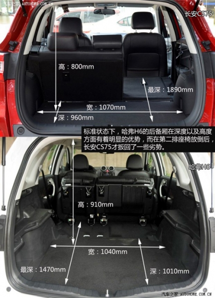 從測量后的尺寸來看,兩款車型差距最大的還是第二排座椅放倒后的深度。由于哈弗H6的第二排座椅放倒后需要向前翻折,因此在深度上要略遜于長安CS75,此外翻折后產(chǎn)生的高度落差相比長安CS75平整的后備廂也有一定差距。