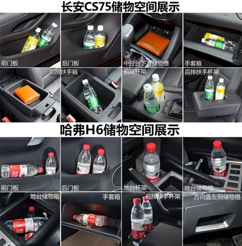 車內(nèi)儲物空間方面,長安CS75與哈弗H6在滿足日常使用的前提下展現(xiàn)了兩種不同的理念。其中長安CS75講究的是“專區(qū)專放”,手機、錢包以及飲料都有各自獨立的區(qū)域碼放。而哈弗H6追求的則是“大”,無論是地臺儲物箱還是手套箱,在容積方面都要略勝一籌。兩種不同的設(shè)計,也算是各有利弊吧。