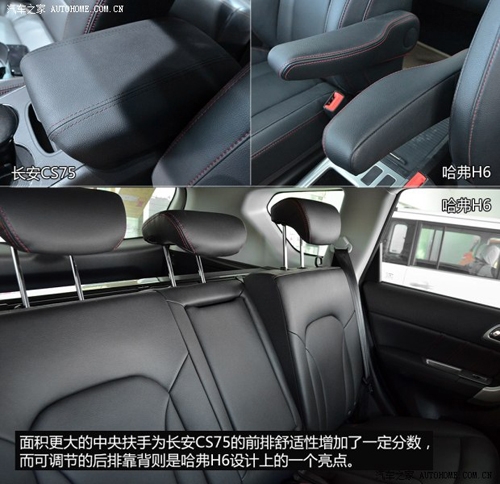 說完了相同的,再讓我們來看看幾處明顯的不同。首先在前排中央扶手上,長安CS75采用了“扶手箱”式的設(shè)計,而哈弗H6則將扶手直接安放在了座椅內(nèi)側(cè),對我個人來說,我還是喜歡面積更大的長安CS75。不過哈弗H6的第二排座椅靠背擁有較為寬泛的調(diào)節(jié)角度,這是長安CS75無法做到的。
