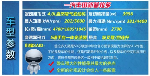 動力方面,新款普拉多依然搭載4.0L發動機,其最大功率275馬力,最大扭矩為381N·m,與發動機匹配的是5速手自一體變速箱。
