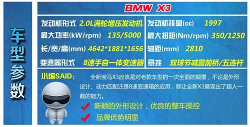車型簡介:現款X3為寶馬于2011年3月23日推出,雖然比起Q5來說在價格方面沒有什么太強的競爭力,不過帶著寶馬的品牌以及純進口車的金字招牌,新X3從上市第一天起就面臨了之前其他幾款競爭對手相同的局面。