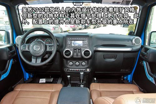 內飾設計方面,2013款牧馬人采用了全新的真皮座椅,并提供黑色和馬鞍棕兩種顏色選擇,還可根據不同車型內飾以Rubicon或Sahara刺繡字樣。不僅如此,新車型還新增了自動防炫目后視鏡帶地圖燈功能,以及內飾照明、擱腳箱照明等配置。