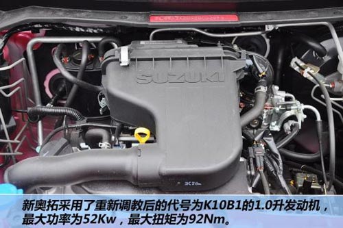奧拓配備了鈴木代號為K10B1的1.0L發動機,功率為52kW,在同排量的發動機中不但屬于比較優秀的類型,并且其峰值扭矩為92N.m/2500-3500rpm,與其匹配的變速箱為5擋手動變速箱,擋位緊湊清晰并且油門與離合器踏板都很輕,駕駛起來比較舒服。