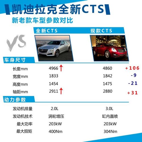 在車身尺寸方面,全新一代CTS的長/寬/高分別為4966/1833/154mm,軸距則為2911mm,相較現款車型而言,車身加長了106mm,同 時軸距也增加了31mm,也為新車提供了更為寬敞的乘坐空間。動力上,全新車型將搭載一臺2.0T渦輪增壓發動機,最大功率203kw,最大扭矩則為 400N·m,與現款車型所采用的3.0L發動機相比,雖排量有所下降,動力性能上則將得到大幅度提升。
