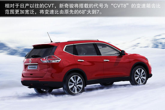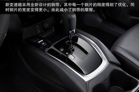 相對于日產(chǎn)以往的CVT,新奇駿將搭載的代號(hào)為“CVT8”的變速箱齒比范圍更加寬泛,將變速比由原先的6擴(kuò)大到7,方法是減小主動(dòng)輪軸的直徑,這樣主動(dòng)輪就可以有更大的變化范圍。新變速箱采用全新設(shè)計(jì)的鋼帶,其中每一個(gè)鋼片的剛度得到了優(yōu)化,同時(shí)鋼片的寬度變得更小,由此減小了鋼帶的摩擦,從而提升了變速機(jī)構(gòu)的工作效率。