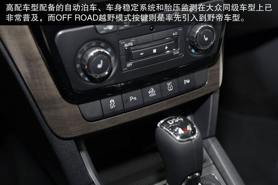 國產(chǎn)野帝內(nèi)飾造型只是在細(xì)微之處進(jìn)行調(diào)整,整體依舊采用了家族設(shè)計(jì)風(fēng)格。全新的四幅式方向盤風(fēng)格更偏運(yùn)動(dòng),雙炮筒式儀表盤除了有中央液晶屏帶來的行車信息外,黑底白字的高反差效果,令數(shù)字更加易讀。高配車型配備的自動(dòng)泊車、車身穩(wěn)定系統(tǒng)和胎壓監(jiān)測在大眾同級車型上已非常普及,而OFF ROAD越野模式按鍵則是率先引入到野帝車型。