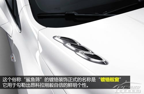 鯊魚篩設計叫做Diamond&Ring鍍 鉻舷窗。Diamond是鉆石形狀的意思,而Ring則是表示環狀設計。鉆石形狀的鍍鉻環鑲嵌在引擎蓋兩側勾勒出昂科拉剛毅自信的鮮明個性。這個東西在一 些性能車上是進氣口,在昂科拉上就純粹是個裝飾,不排除今后的哪一天昂科拉出個RS版或者ST版,這兩個地方就變成是進氣口了。