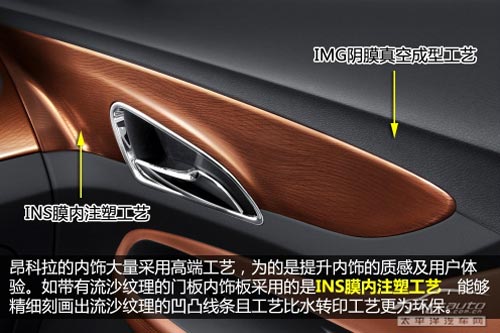 IMG陰膜真空成型工藝被用于制造昂科拉中控臺和門板上部。使用此工藝制造的內飾表面具有皮質的感覺,觸感是柔軟的,而非低端工藝制造出來的硬邦邦的塑料。