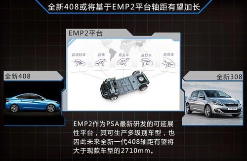 全新一代408將基于PSA集團最新研發的EMP2模塊化平臺打造,該平臺能衍生出轎車、跑車、SUV以及MPV等多種車型。而關于該平臺技術,神龍汽車有限公司技術中心研發人員向記者透露:EMP2平臺的軸距涵蓋了2620mm-2840mm,甚至是2900mm。同時隨著目前國內市場對于車內空間的特殊性要求,該款全新產品或將相比現款車型2710mm的軸距進一步加長。并且得益于新技術的應用,有望使全新一代408車型的重量更低。