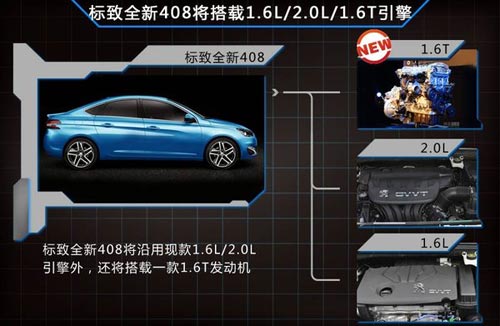 標致全新408車型將搭載現款采用的1.6L和2.0L兩款自然吸氣引擎,此外,為迎合小排量增壓化這一趨勢,神龍汽車有限公司技術中心副總部長談民強在接受網通社記者采訪時表示:標致408車型未來還將搭載E動戰略中的1.6THP增壓引擎。該款發動機是PSA與BMW兩大集團聯合研發的最新直噴式渦輪增壓發動機,最大功率115kW,最大扭矩240Nm,其動力性提高約40%-70%,油耗和CO2排放降低約10%。