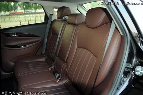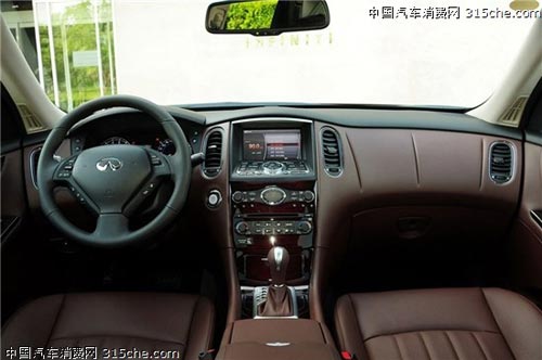 英菲尼迪EX內飾的做工用料幾乎無可挑剔,出色的接縫裝飾工藝,大量的木紋裝飾盡顯高檔的品質。大量的高檔皮革的使用以及酒紅色的桃木裝飾,極其奢華。座椅非常柔軟舒適,只是包裹性比較欠缺。